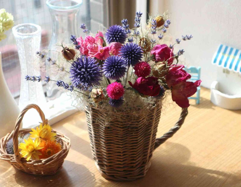ドライにしても色濃く残る花材を選ぶようにしています。ルリタマアザミや千日紅はドライにしても、十分楽しめますよ💠💠