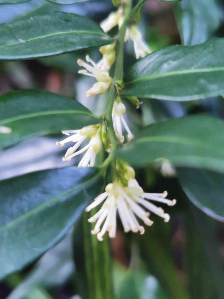 私も2年位前に植物園で初めて見ました😊その時花は咲いて無かったのですが調べました、実は赤から黒くなるみたいです。雌雄異株でツゲ科です。