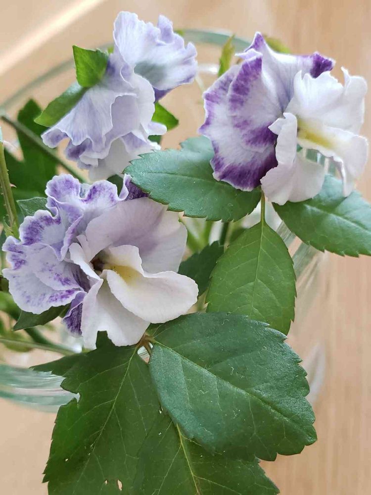ぞうさんビオラ、長くのびてるのを切って、花が終わった薔薇の葉っぱといけてみました。