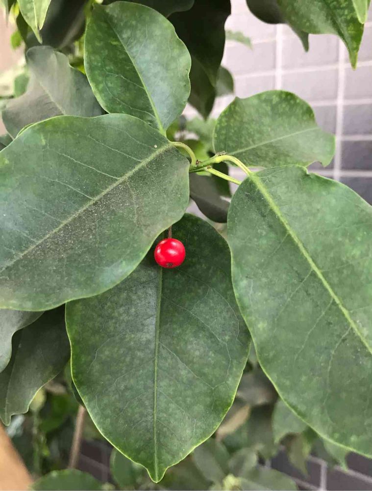 通り道のお店の前にある木です。かわいい、赤い実。❣️この〜木なんの木?🌲