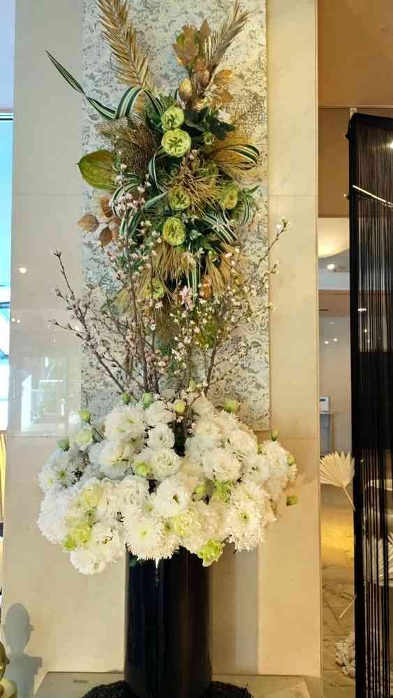 このpicは先日行ってきた三河湾リゾートリンクスホテルロビーの装花です。花瓶にいけてあるのは生花の白いお花でした。