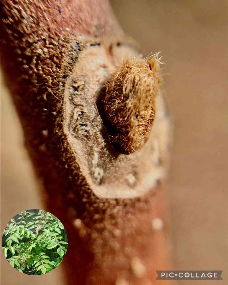 半球形の冬芽があるが、黄褐色の軟毛がみつに生えるため見えない!それを葉痕がぐるりと囲む!