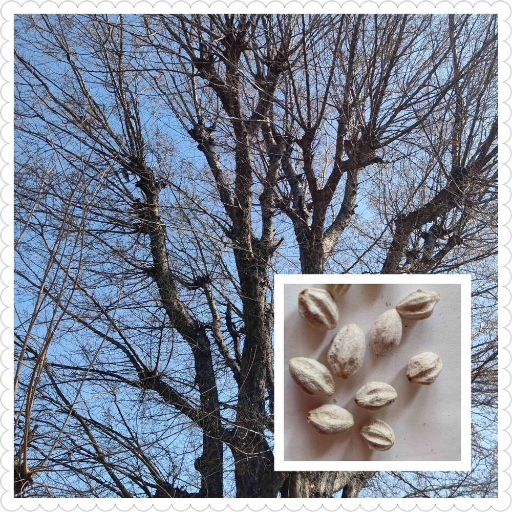 散歩で見付けた木の実❓️種❓️小さくて固く、溝(畝のよう)があり、粉砂糖をまぶしたような感じです。この大きな裸の木の下に(今現在、蕾はついてません。葉も何も無し)。手がかり無さすぎ😭