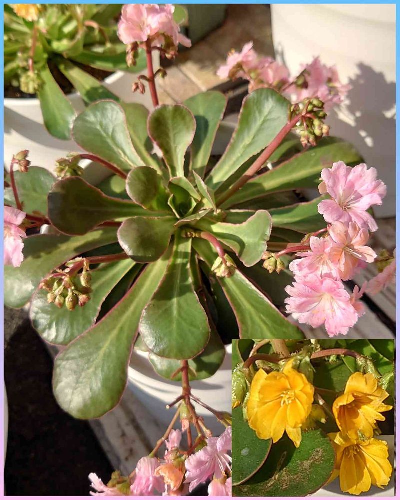 今日の一発めのpicは一鉢200円でタグなし何色🔴🟠🟡が咲く🌸かお楽しみ❔ヤミ鍋状態品のレウイシア開花です㊗️