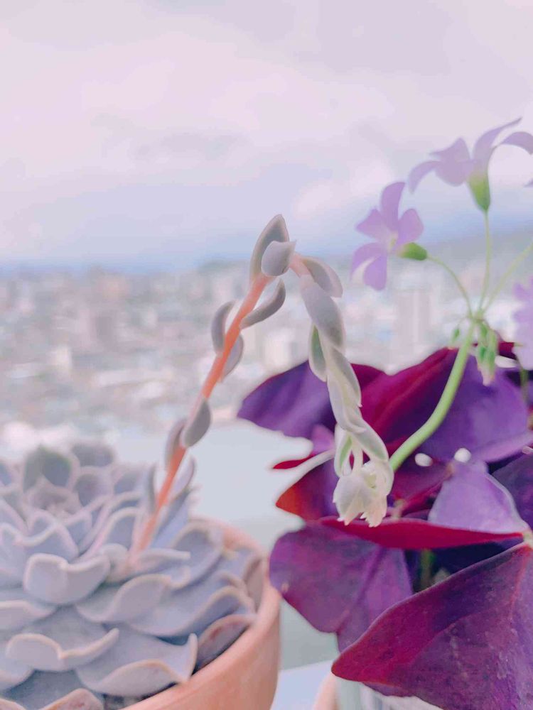 オキザリストライアンギュラ(だったっけ?)も風にも負けずふわふわ咲いてます。お昼しか咲かないのでお休みの日限定の🌸💜🌸💜🌸💜