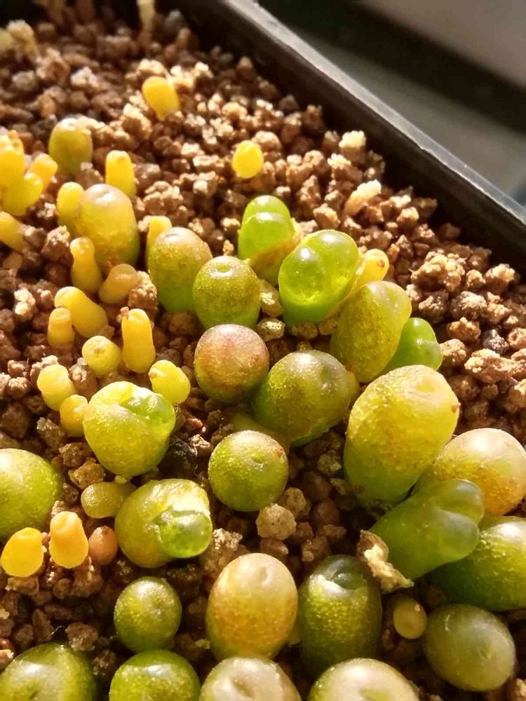 オフタルモフィルムの実生半年。今年はヒーターマットも使って加温し、室内のフレームでさんさんと日を当てて育ててたら順調に大きくなってます。