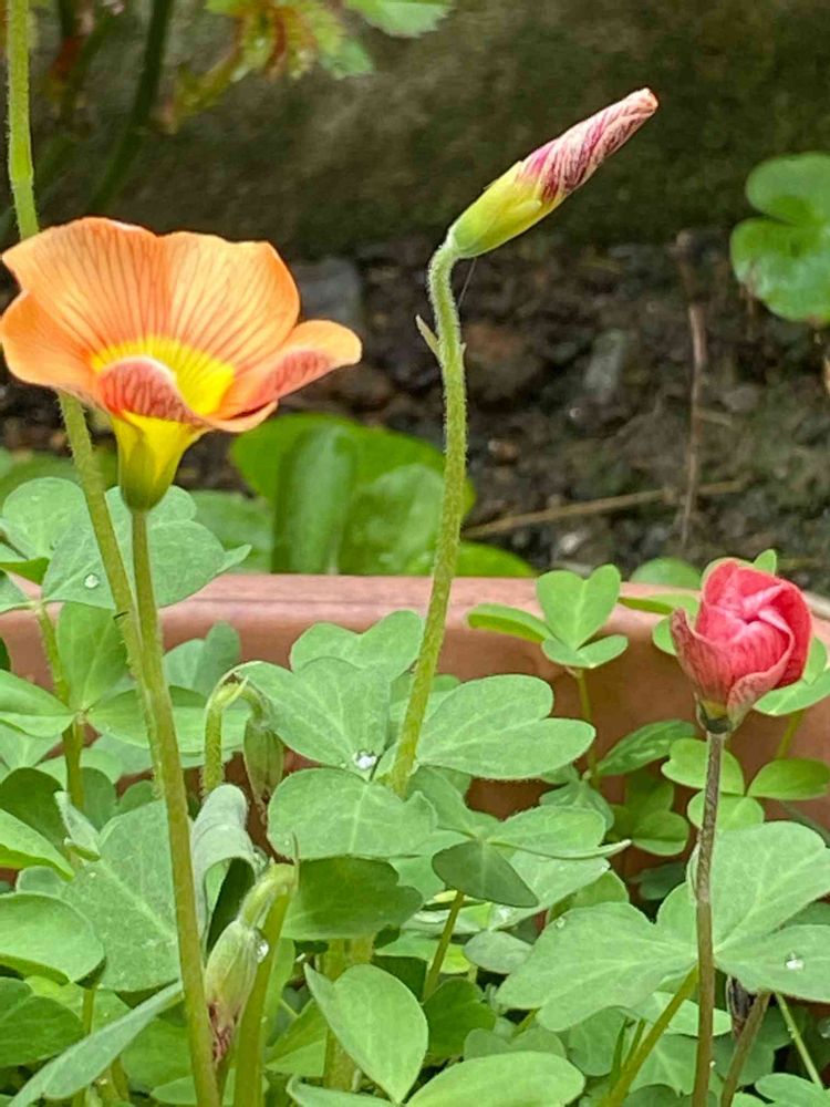 オキザリス🌸は 鉢の葉っぱが無くなると つい鉢をひっくり返し👍他の花を植えてしまうけん あちこちで芽が出てたり