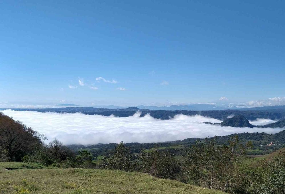 実際に見ると、ピコ・デ・オリサバはもっと大きく見えるんですけど、スマホで撮ると、遥か遠くに小さく見えて残念です。雲海の中に入ったら、とても静かで鳥のさえずりが聞こえました。朝から得した気分になりました。
