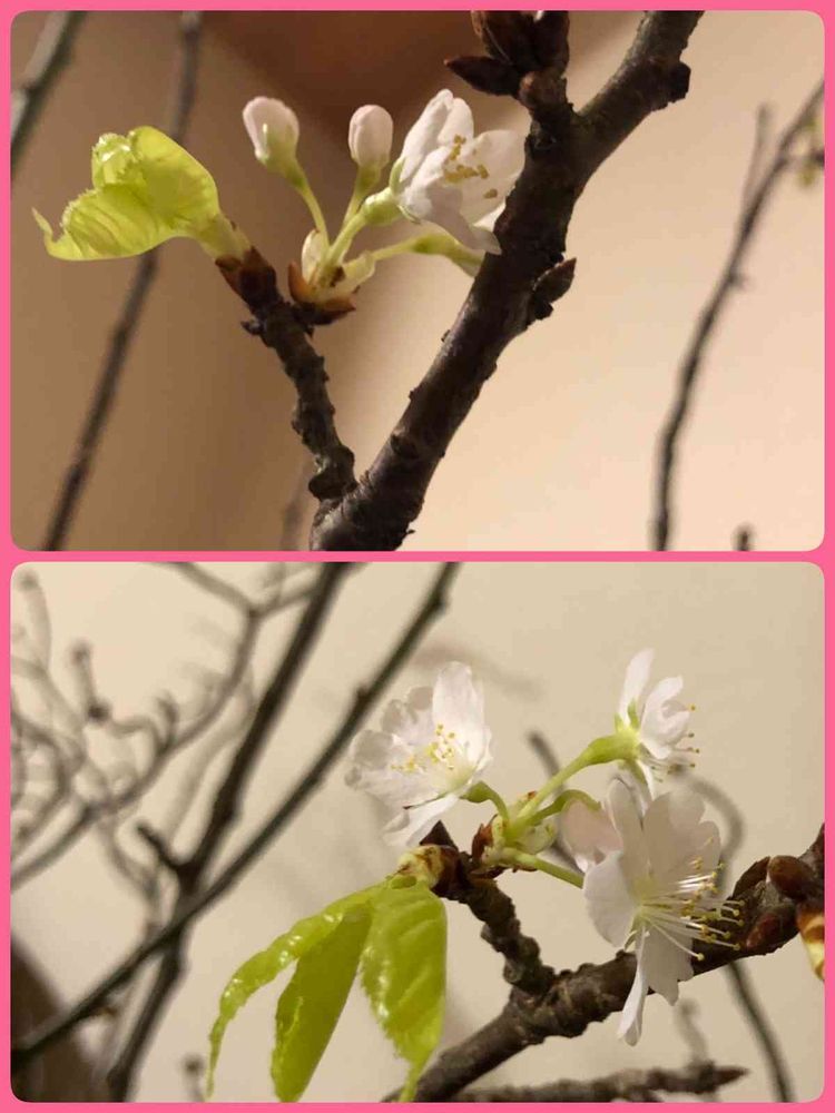 友人宅の桜の木が強風で倒木したので枝を部屋に入れたら咲いたそうです🌸🌸