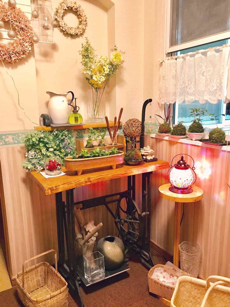 ボロボロになってしまった足踏みミシン。思い切って、上の部分を取り除き、板を乗せてみた^ ^