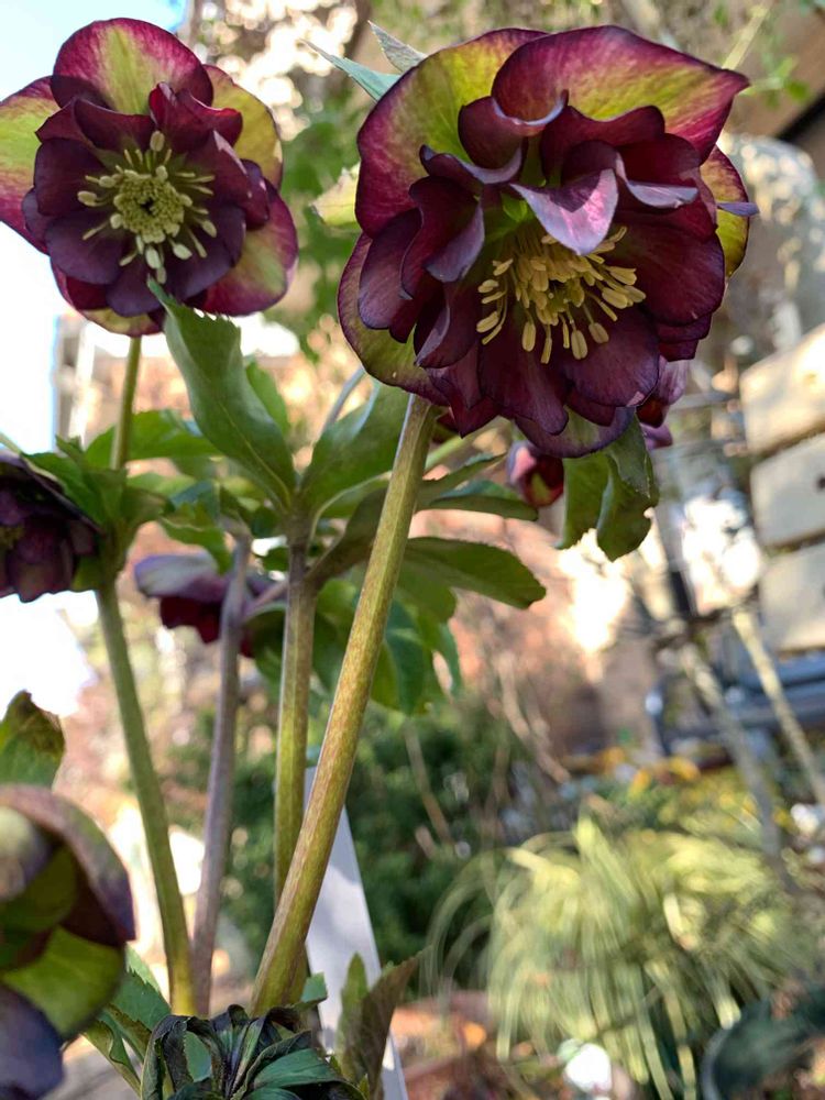 ワイン色の八重に一番外の花弁だけグリーンが入るこのクリスマスローズ、朝日を浴びてキラキラ✨しています。