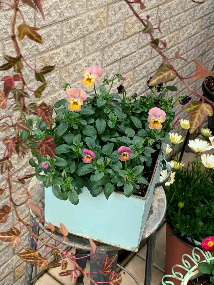木箱に植えられたビオラ💕とっても可愛いですね😊