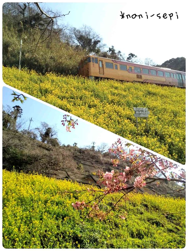 伊予灘物語の列車が、スピードを、ゆるめ海と、春の花のなか、小旅行を、楽しみながら、通り過ぎました。