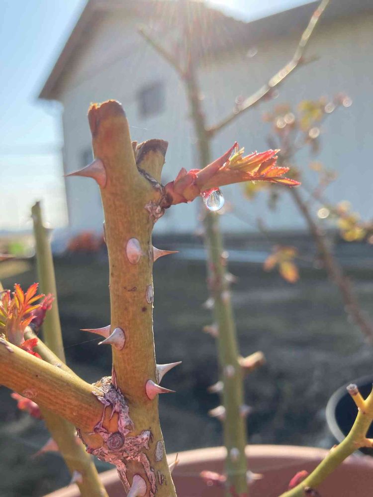 今朝の庭の薔薇の新芽に滴が💧着いていてキラキラして綺麗でした🤗あちこちで春、春、春、って囁いてま〜す💞🌸☘️☘️🌸