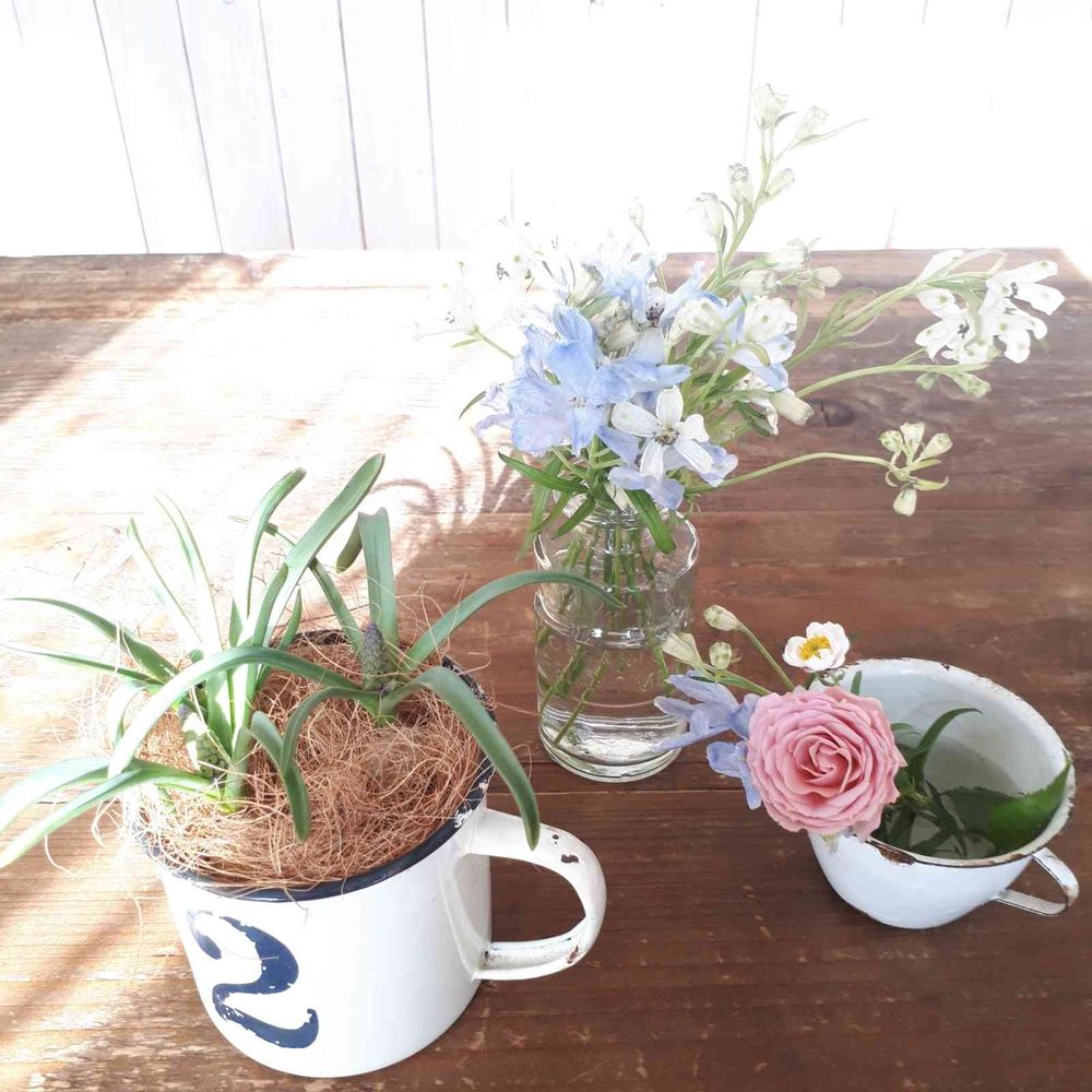 ダイニングテーブルに暖かな日差しとかわいいお花達🌼見てるだけで癒やされるよ〜💕💕