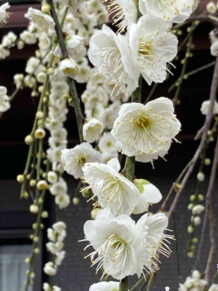 毎年楽しみにしている枝垂れ白梅。