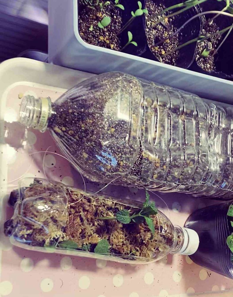 買ったアップルミントとスペアミントのポット苗が結構成長してたので、剪定がてら挿木的な事で増えるか実験。なんかラボ感が出てきて楽しい😊