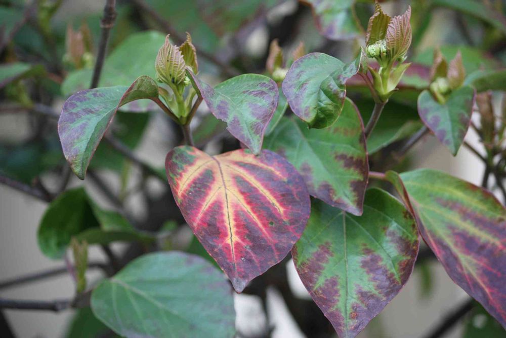 今年の若葉と花芽が見えますが、去年の葉が美しく色づいて〜🍁