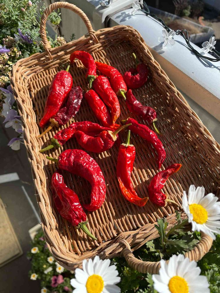 完熟させたまま冬越しした万願寺とうがらしを種蒔き準備で干してます。