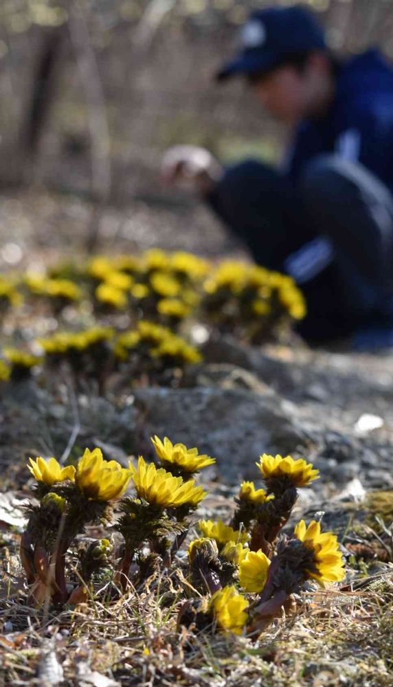 福寿草を見てる姿、お父さん顔負けですね👨( '-' 👨 )トーチャン