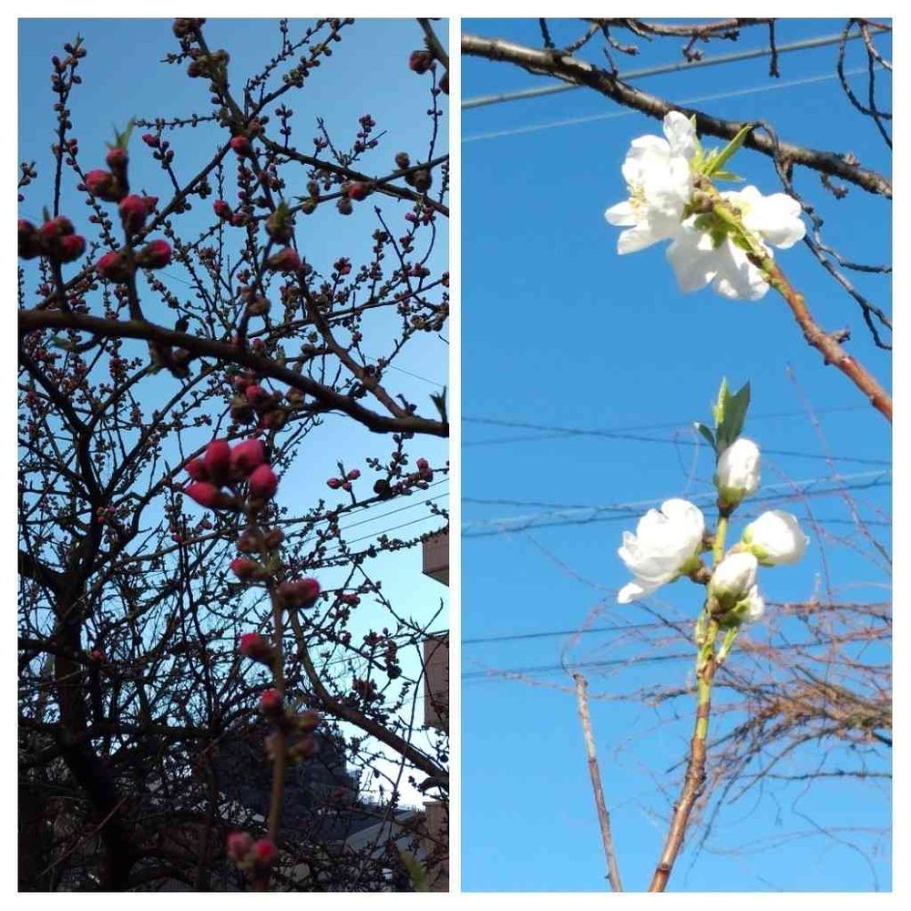 ここ数日の暖かさで花桃がちらほら咲き始めた🌼用水沿いにはいろいろな種類が植えられています*写真は赤(矢口)白(照手寒白)