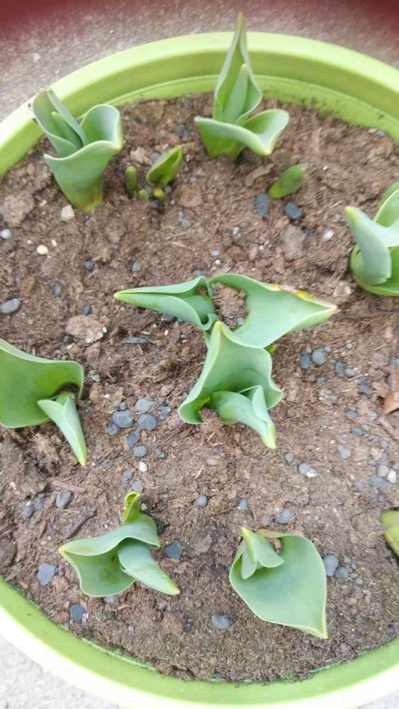 昨年秋に植えたチュウリップの球根、寒さと大雪の下にいたけど、元気に成長続けています!この鉢は赤の花だったかな...😊😊🌷