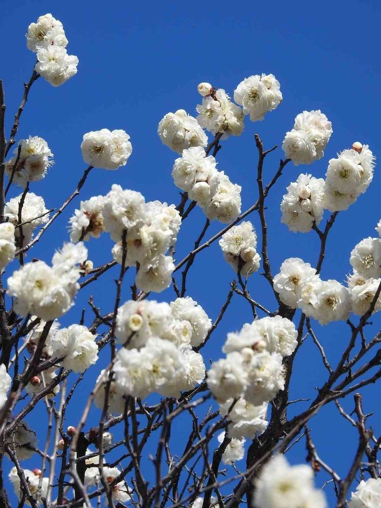 青空とコラボする綺麗な白い色の🌼八重の梅の花🌼