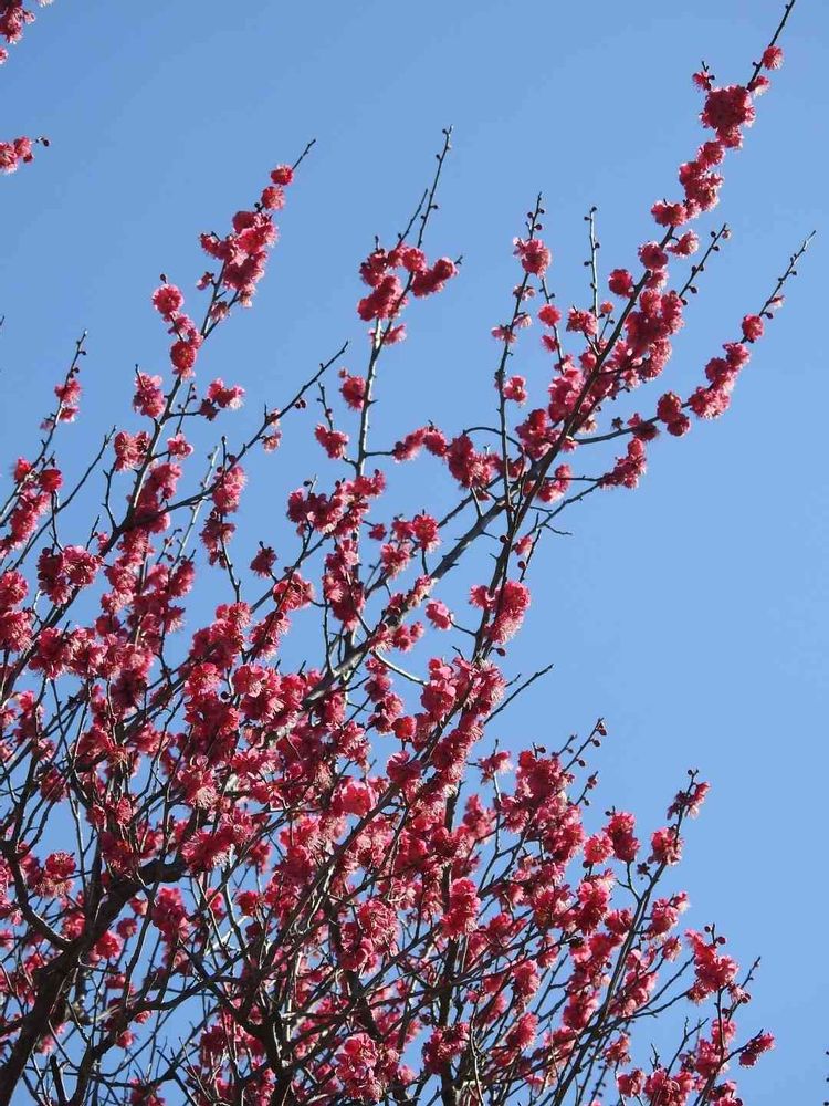 青空とコラボする綺麗な赤の🏵八重の梅の花🏵