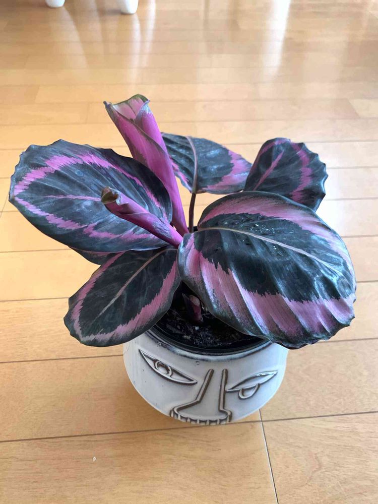 この子、カラテアレッドモジョという、この置物使いたいので、たまたまこの赤の葉っぱ選んだ、それも珍しい新種らしい。