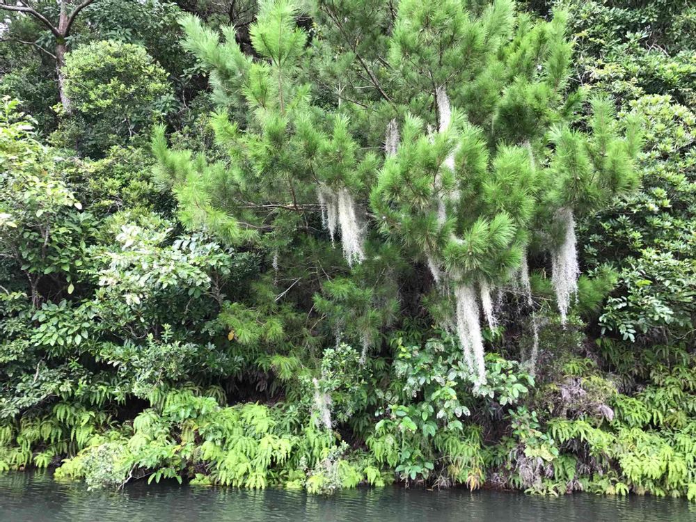 沖縄ビオスの丘にて。水辺の松にひっかけている大量のスパニッシュモス。水がたくさんで元気よさそう。