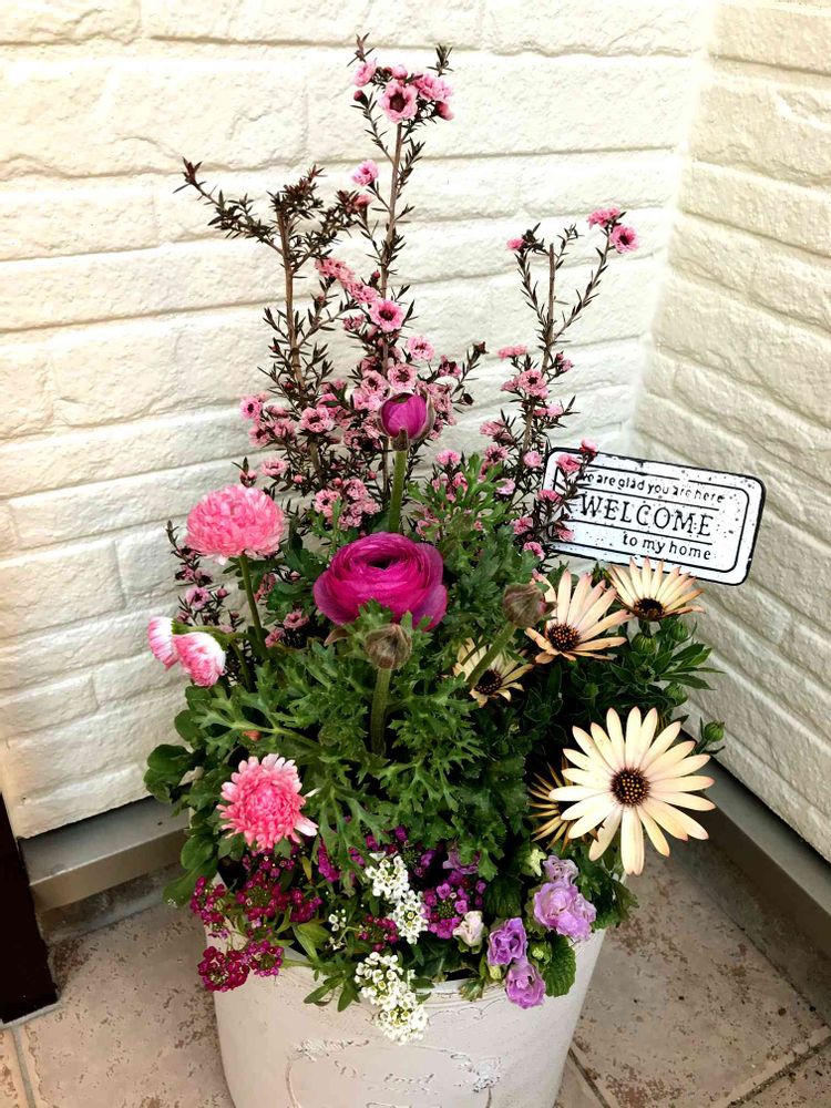 お花屋さんで葉牡丹との寄せ植えだった為半額になってたのです。葉牡丹3つは庭の隅っこに植えて、デイジーとラナンキュラスとオステオスペルマムとチェンジしました🌸弱ってたジュリアンも復活してきました〜❗️