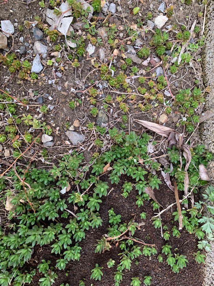 雑草セダムのこの勢い…と思ってよく見たら、コレ、珈琲ガラ撒いたとこと撒いてないとことの差が凄くない?