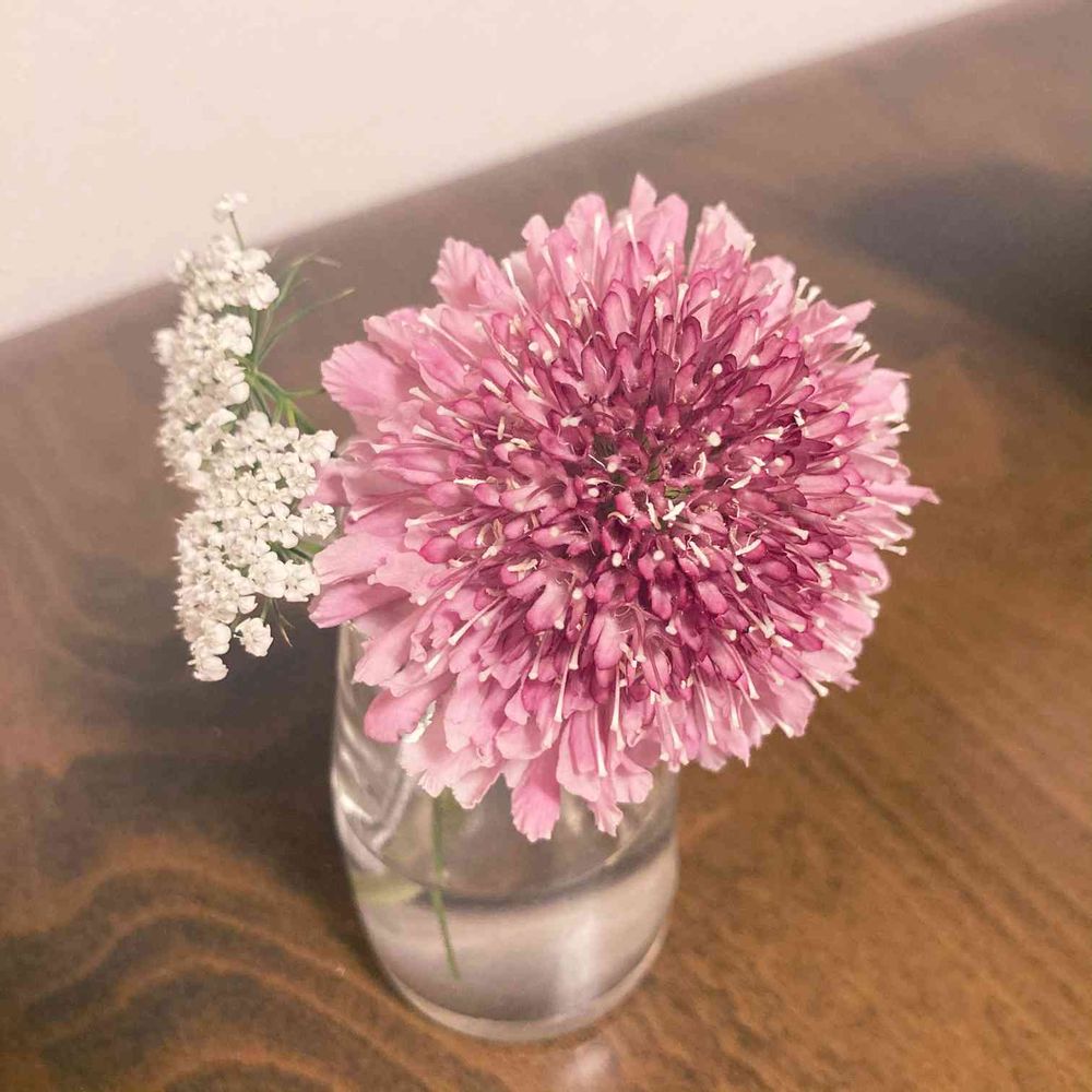 スカビオサの首がだらーんとなってしまったので、短くして小さな瓶に移動して、なんとか見られる様子になった
