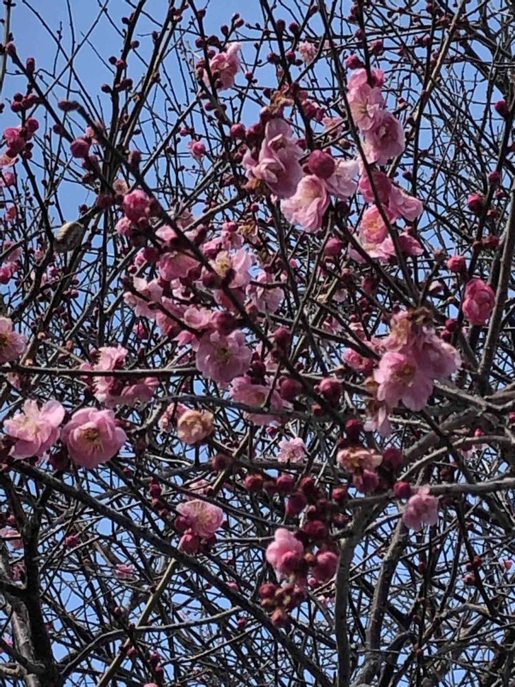 2月中旬、茂木町で見かけた、瓦塀を越えて、見てと訴える様な、ピンクの可愛い💕紅梅の花🌸🌸🌸‼️