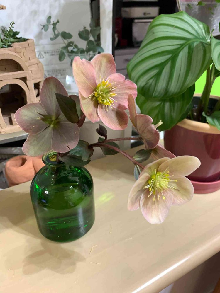 クリスマスローズピンクフロスト、切り花で無印芳香剤詰め替え瓶で一輪差し、風情あるね😊