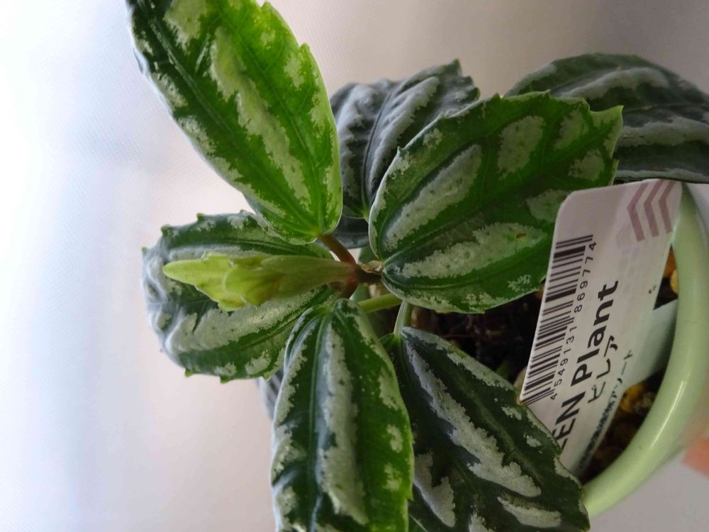 ダイソー産ピレア、気が付くと新芽が開こうとしています。