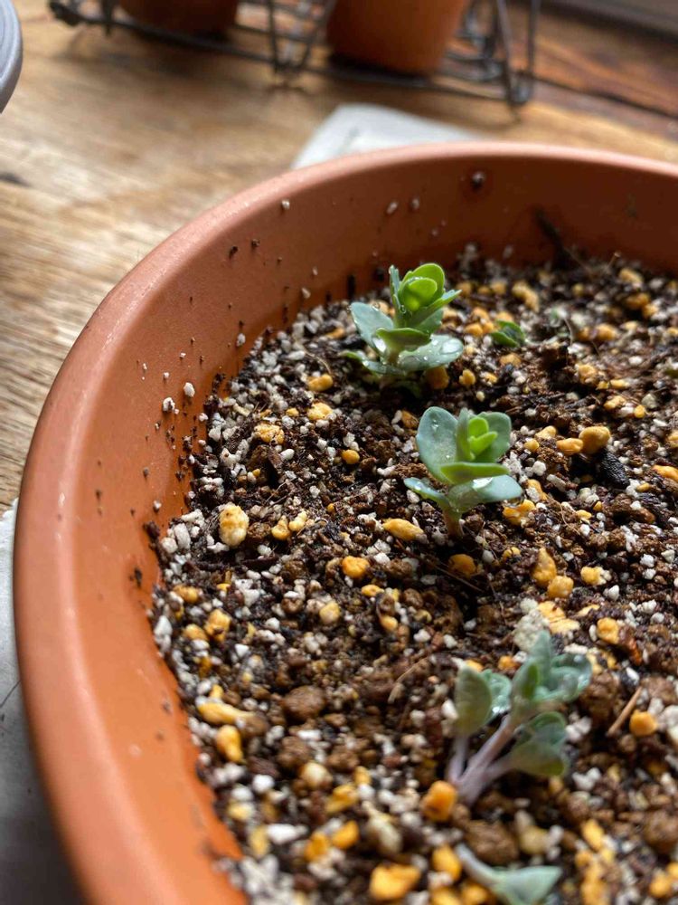 切り花のセダムから出てきた脇芽を挿しておいたやつ。ようやく生長しはじめた。