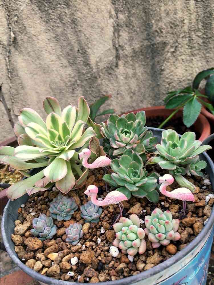 フラミンゴさんと愛之助の斑入り葉が爽やかなハーモニーを奏でとるわ\( ¨̮ )/💕