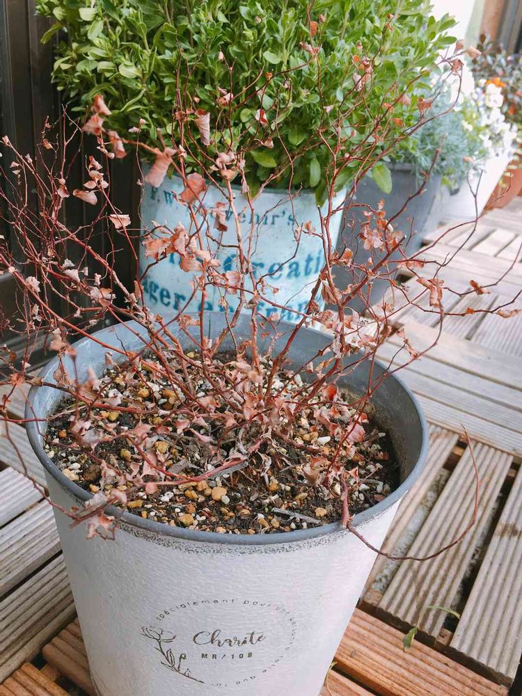 スピレア、落葉して「大丈夫なのか」ってくらいヒョロヒョロ〜。追伸:切ってみました→みどりのまとめ。