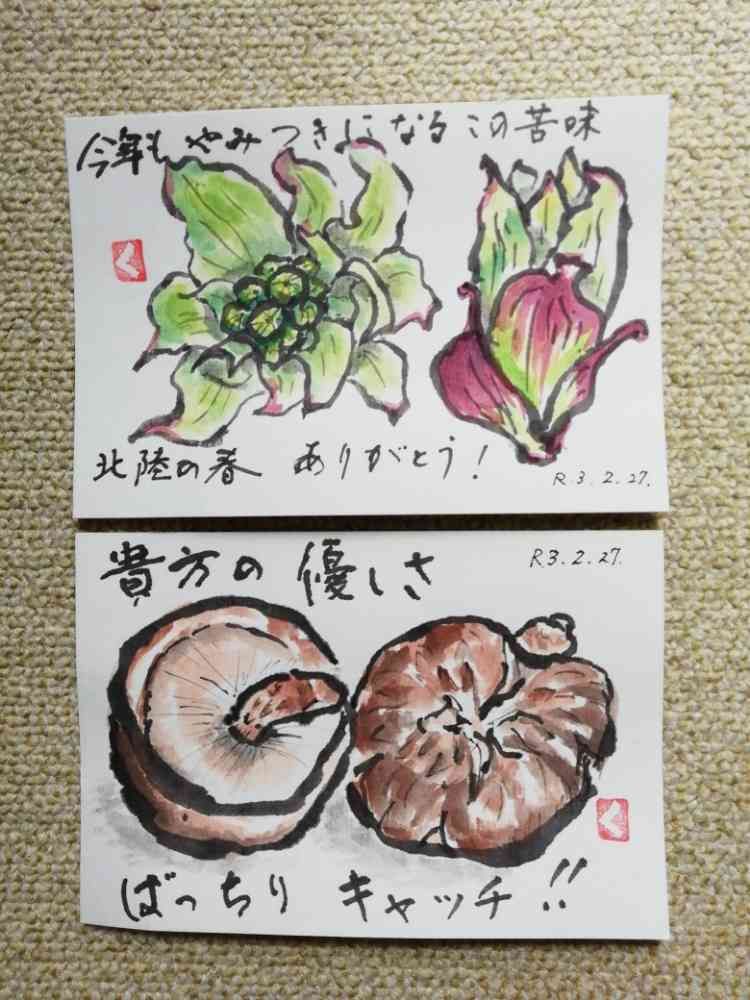 フキノトウ,原木しいたけ,絵手紙の投稿画像