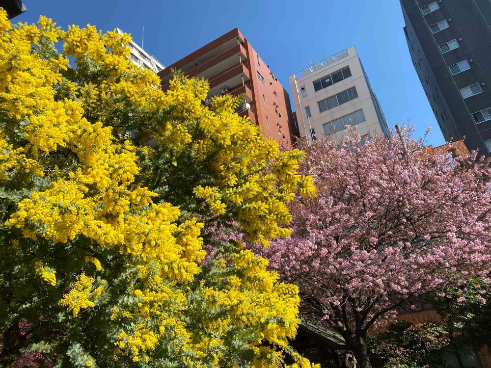 今日のお花ギンヨウアカシアさん。満開です。早咲きの桜とのコラボが素敵です。