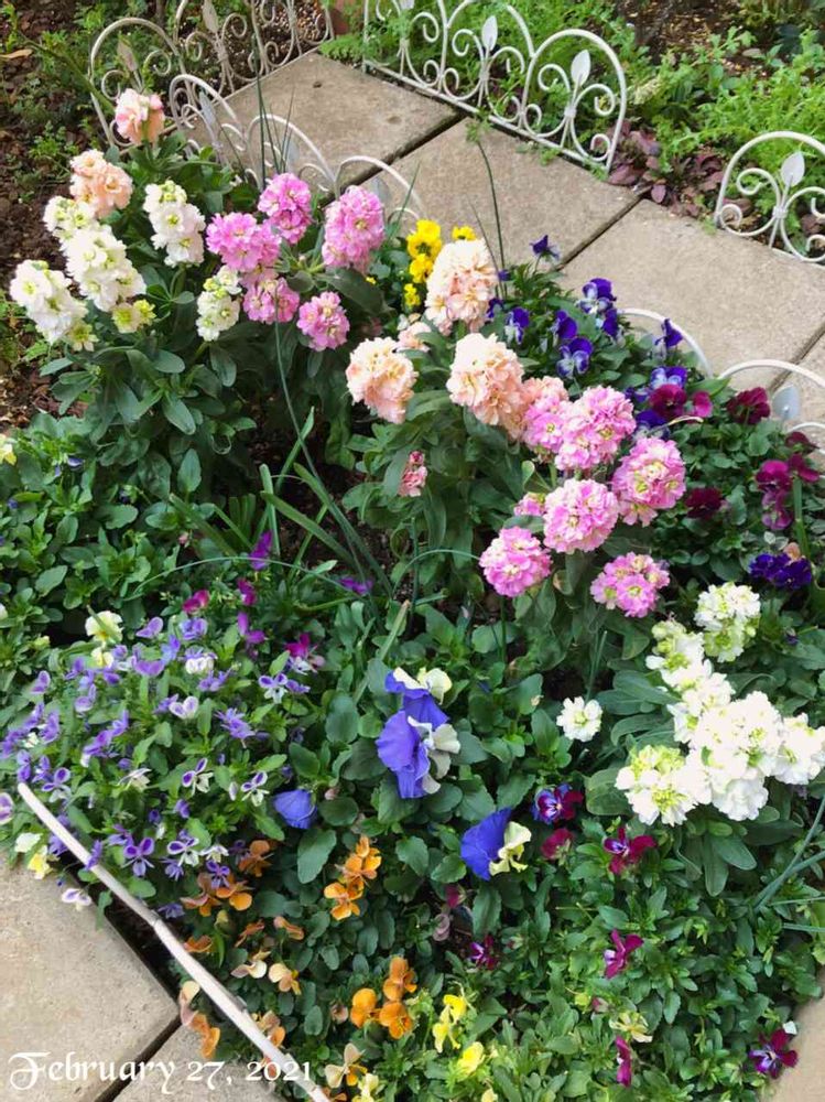 冬咲きコーナー。合間にムスカリやチューリップの球根を仕込みましたがネギのように葉が徒長してしまいました。