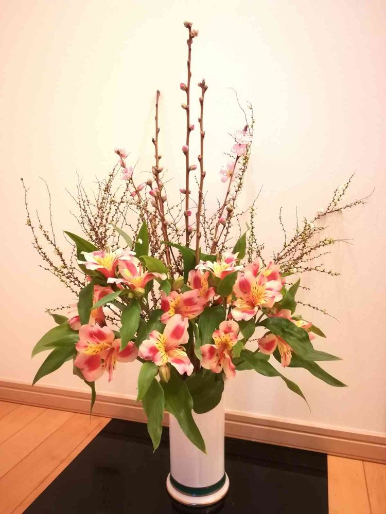 ピーチカラーのアルストロメリアと桃の花で明るく暖かみのある素敵ないけばなになりましたね💕ひな祭り🎎気分も高まりますね😍