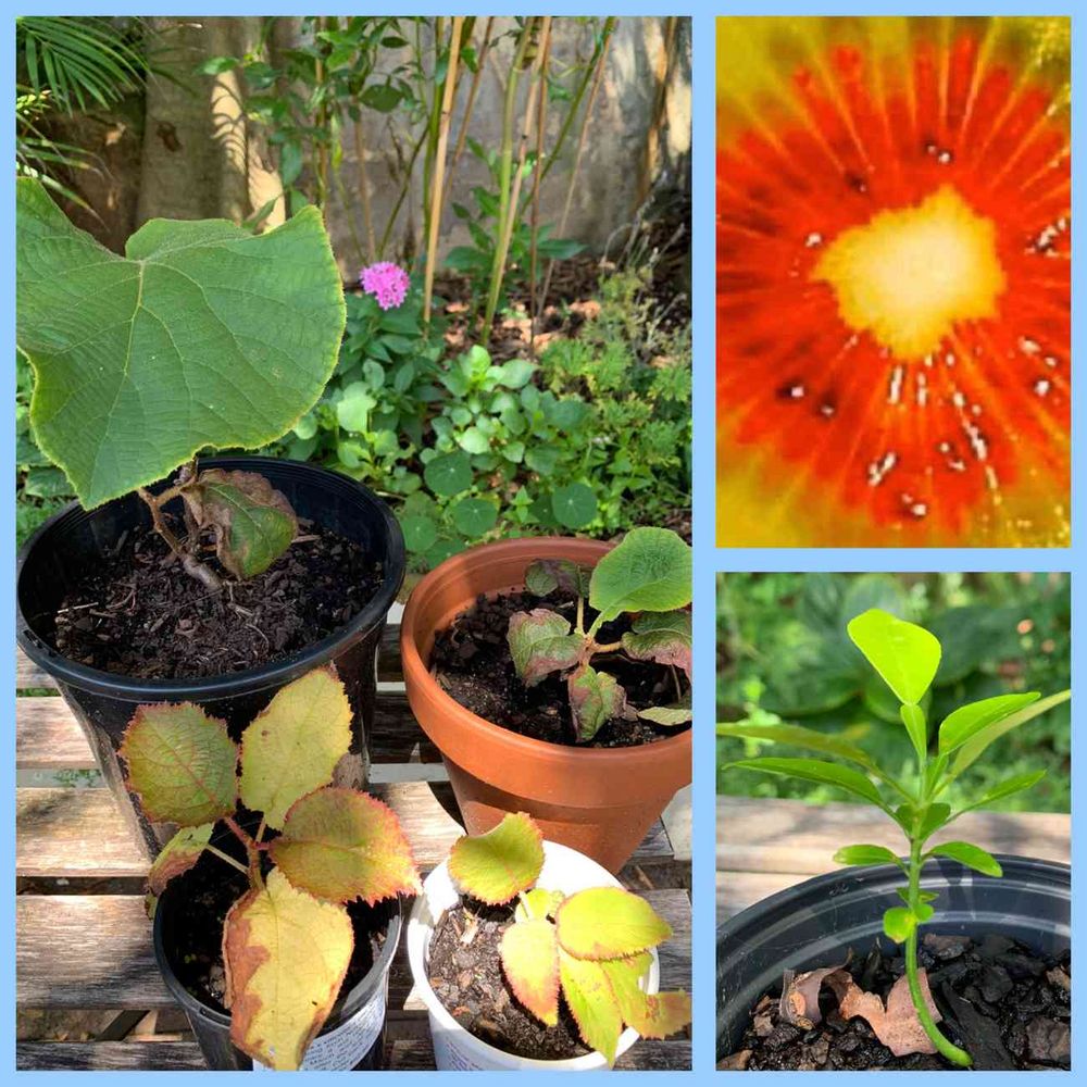 5月〜6月の短期間だけスーパーに出回る真ん中が赤くてとても甘いキウイフルーツの種をまいて620日目のもの(写真左後ろ)と去年まいたもの(写真左前)🥝