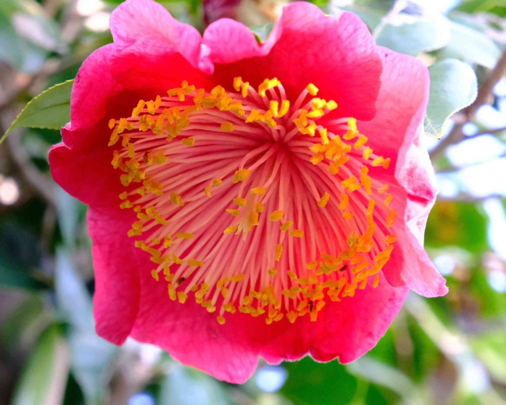 椿は雄しべが筒状になっているのが普通だけど、広がっているシベを「梅芯」と言うらしい