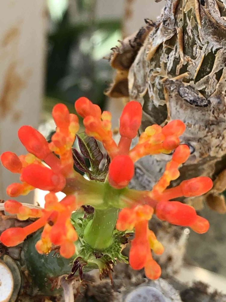 熱帯植物、面白い形だったので思わずパシャリ。😋 名前は「サンゴアブラギリ」、幹はトックリ状の面白い樹形、花姿はまるで珊瑚。南国の海に行ったような気分に浸れます。😋😘