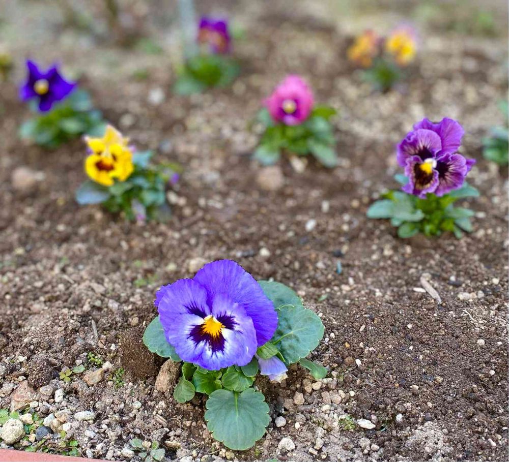 種をまいて紙コップで育てたパンジー・ビオラを、小さな花壇に植えました✨