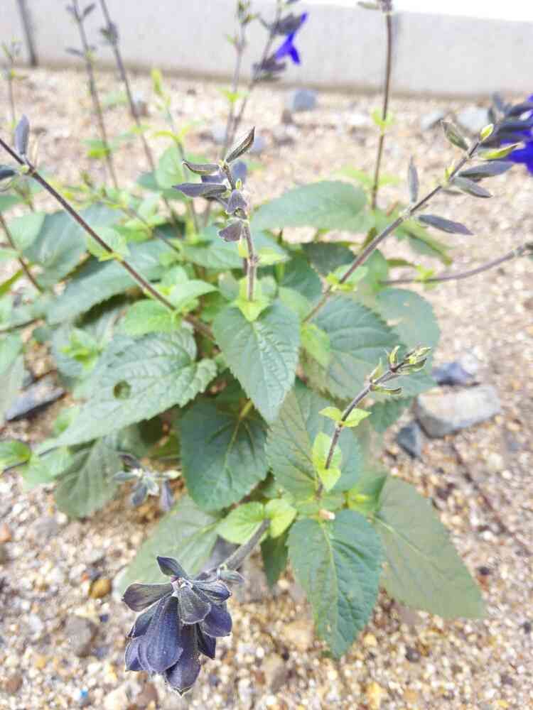 この青い花で黒い茎の植物の名前は、サルビア・グアラニティカといいます。