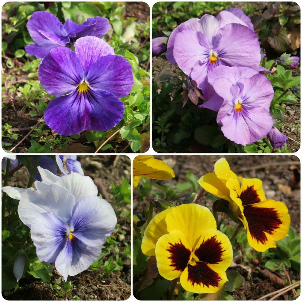 善通寺境内の花壇で4色のパンジー・ビオラが元気一杯に咲いてました。