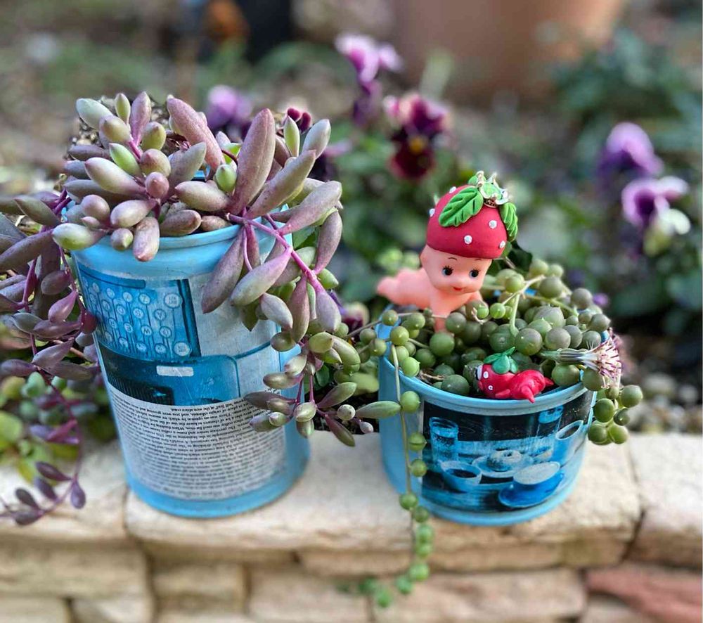 ルビネちゃんたちとブルーのリメ缶と良く似合って可愛い💖